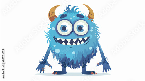 © Mehran, Fototapeta premium Happy Halloween! Cute blue monster stands with four eyes, fangs, and fur. Cartoon baby character looks funny and childish. Flat design. Isolated on white background. Vector