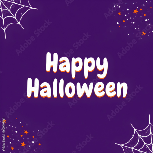 © NusratJahan, Fototapeta premium Happy Halloween greeting card design featuring white and orange text on a deep purple background with white spiderwebs and orange and white confetti stars in the corners
