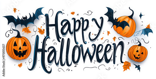 © Imane, Naklejka premium happy halloween lettering calligraphy logo with pumpkin, bat and spider web