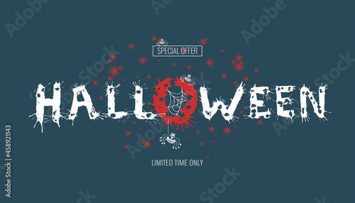 © Andrii, Fototapeta premium Happy Halloween lettering with splash. Greeting card calligraphy with spiders and web for holiday banner, poster or invitation greeting card, sale placard or flyer. Vector illustration