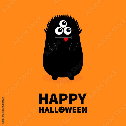 © worldofvector, Naklejka premium Happy Halloween. Monster black silhouette. Open mouth. Three eyes, tongue, hands. Funny Cute cartoon baby character. Flat design. Orange background. Isolated.