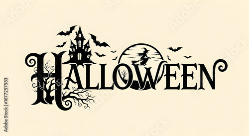 © A-STOCK, Naklejka premium Happy Halloween spooky text illustration with a haunted house, bats, and a witch flying on a broomstick for a festive celebration