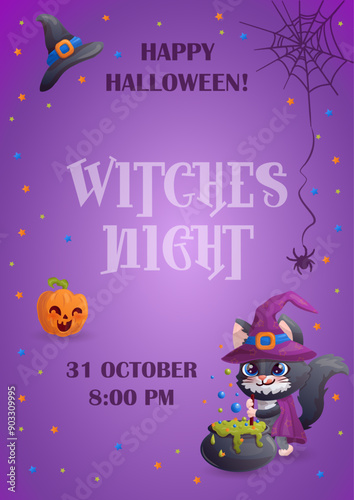 Fototapeta premium Happy Halloween template with amusing cartoon black cat is making witch's...
