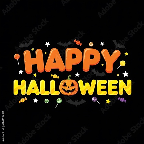 © graphicsobai, Fototapeta premium Happy halloween text with pumpkin and candy on black background