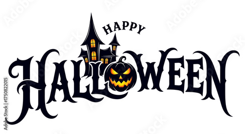 Fototapeta premium Happy Halloween typographic logo with a spooky haunted house and a glowing jack-o'-lantern pumpkin