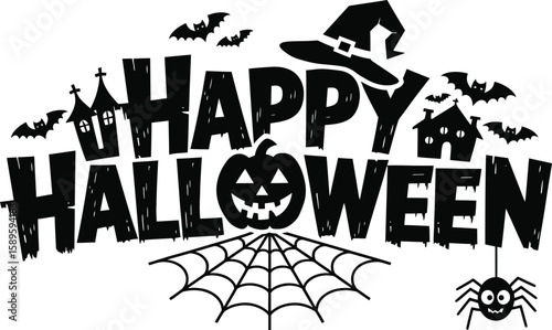 © Ahamedpicu, Fototapeta premium Happy Halloween typography with Pumpkin, Bats, Spider Web, vector illustration