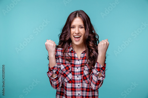 Fototapeta premium Happy handsome young woman posing isolated over the blue background