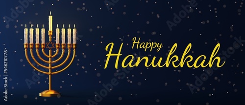 © photoguns, Naklejka premium Happy Hanukkah banner design. Traditional Jewish holiday Hanukkah background with menorah and candles.