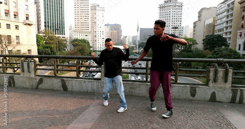 © Marco, Obraz premium Happy hispanic and black African man dancing in city