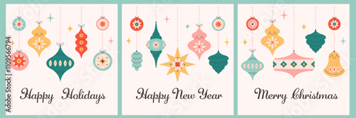 © Amahce, Fototapeta premium Happy Holidays and Merry Christmas greeting cards with Christmas tree toys. Winter holiday background for congratulations. Vector illustration in flat style