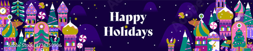 Fototapeta premium Happy holidays banner. Christmas town, snowflakes, gifts, christmas tree,...