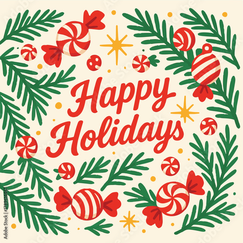 Obraz premium Happy Holidays Card with Candy, Peppermints, and Pine Needles