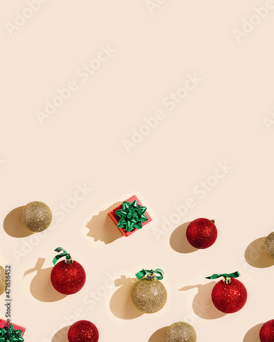 © yrabota, Fototapeta premium Happy holidays, Merry Christmas, New Year background with copyspace. Bright pattern with shiny red and golden Christmas balls and gift box