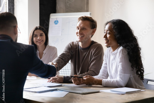 Fototapeta premium Happy hr employer handshake male applicant partner at interview meeting
