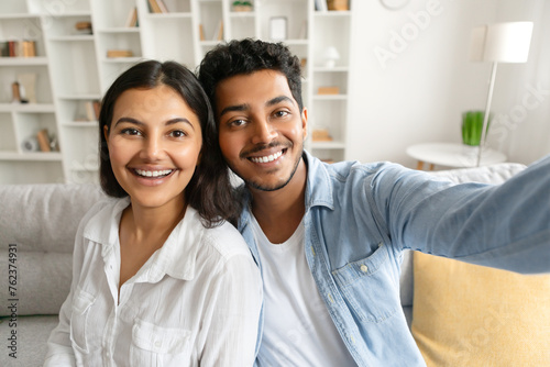 Fototapeta premium Happy indian couple taking selfie with cheerful expression