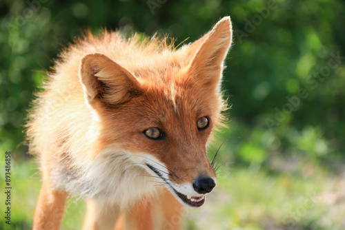 © Tatiana, Fototapeta premium Happy Joyful Sly Red Fox with open Mouth looking forward against Green Foliage background on sunny day. Fox is grinning with sharp fangs