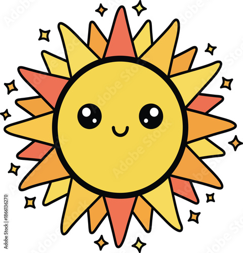 Fototapeta premium Happy Kawaii Sun Character with Orange and Yellow Rays Surrounded by Sparkles