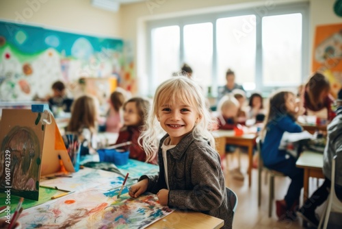 Fototapeta premium Happy kid drawing pictures school architecture building.