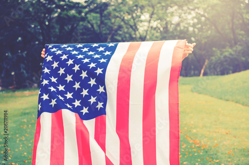 Naklejka premium Happy kid little child running with American flag USA celebrate 4th of July