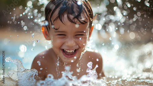 © goami, Obraz premium happy kid swimming and bathing in lake or river in summer at sunset, joyful child splashing water