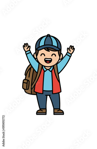 © Cari, Fototapeta premium Happy kid with backpack raising hands vector illustration
