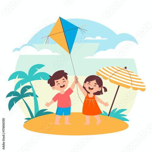 Fototapeta premium Happy Kids Flying a Kite on the Beach – Fun Summer Cartoon Illustration.