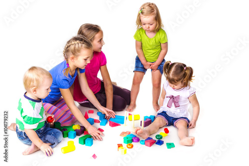 Fototapeta premium Happy kids playing with building blocks isolated on white