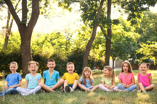 Obraz premium Happy kids sitting on grass in park