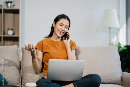 © NINENII, Naklejka premium Happy lady working sitting on sofa at home office. successful entrepreneurship and career concept.