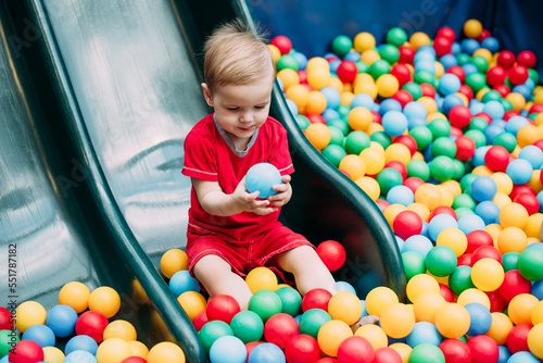 © dashamuller, Obraz premium Happy laughing boy 1-2 years old having fun in ball pit in kids amusement park and indoor play center. Activity toys for little kid
