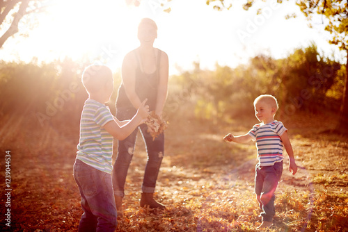 © peopleimages.com, Fototapeta premium Happy, leaves and mom with children in nature for playing games, bonding and have fun together. Family, park and mother with kid excited for season change, autumn or fall for childhood outdoors
