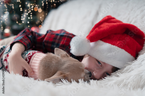 © Anna, Fototapeta premium Happy Little boy and dog at Christmas
