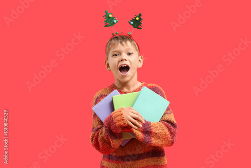 Naklejka premium Happy little boy with books on red background. Christmas celebration