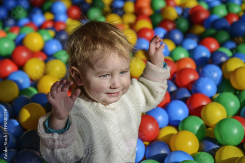 Obraz premium happy little child plays on a playground filled with colorful plastic balls.