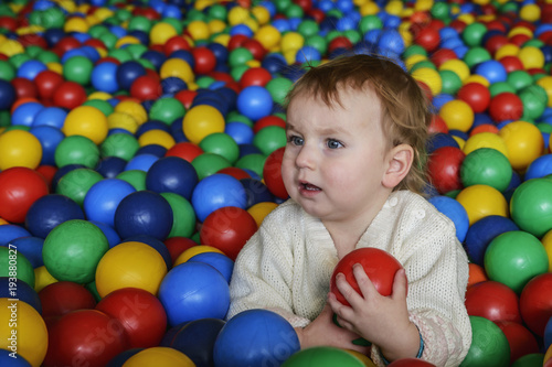© igorgeiger, Obraz premium happy little child plays on a playground filled with colorful plastic balls.