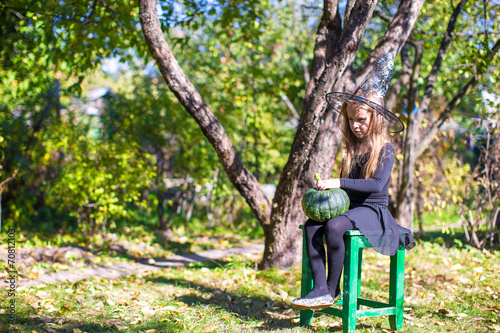 © travnikovstudio, Naklejka premium Happy little girl in halloween costume with jack pumpkin.Trick