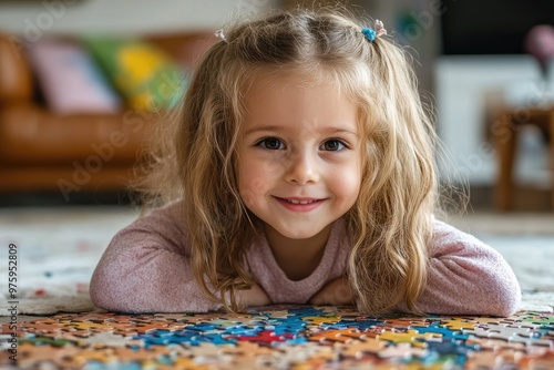 Fototapeta premium Happy little girl lying on the floor playing with puzzle