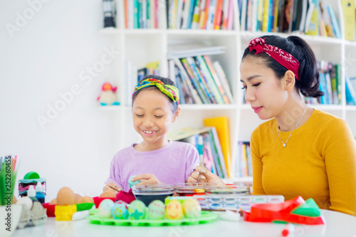 Naklejka premium Happy little girl paints eggs with her mother