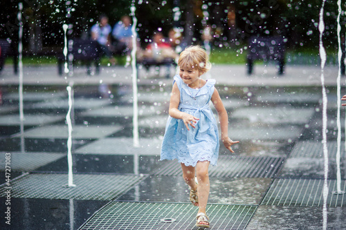 © anastasiyaand, Naklejka premium happy little girl running under splashing water