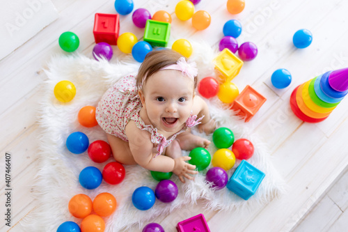 © Any Grant, Obraz premium happy little girl sitting in a white room in a red dress with bright toys and looking at the top