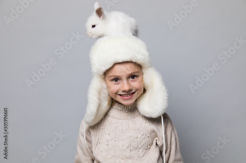 © Smart Future, Obraz premium happy little girl with adorable rabbit at christmas time.