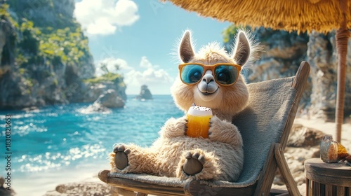 Fototapeta premium Happy llama relaxing on beach lounger, drinking beverage, wearing sunglasses.