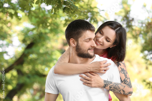 Fototapeta premium Happy lovely couple resting in park on sunny day