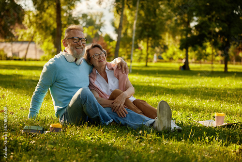 © Nomad_Soul, Fototapeta premium Happy loving romantic couple embracing while rest on grass in park