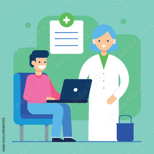 © Sadhin07, Fototapeta premium Happy Male Patient Using Laptop with Female Doctor in Modern Clinic Setting