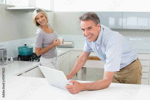 Fototapeta premium Happy man and woman with laptop in the kitchen