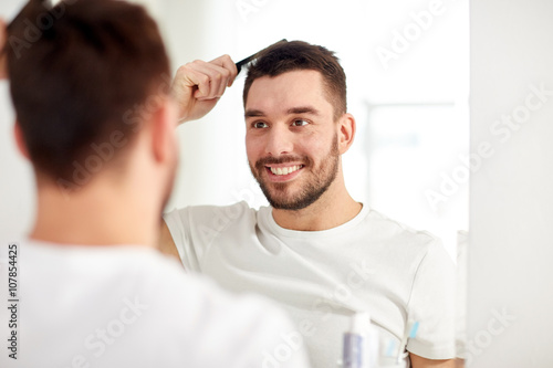 Obraz premium happy man brushing hair with comb at bathroom
