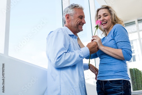 Fototapeta premium Happy man giving rose to woman