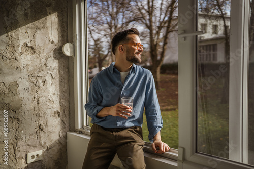 Fototapeta premium Happy man in casual wear drinking water at window
