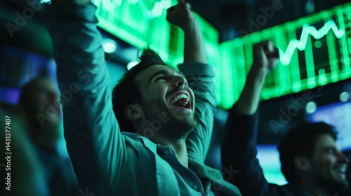 © Marco, Obraz premium Happy man in suit watching green screen of stock market exchange